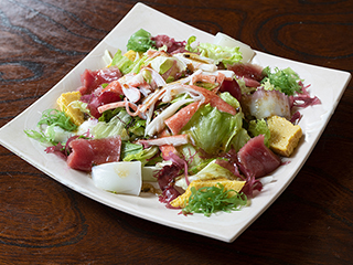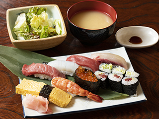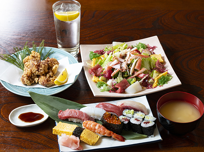 ボリュームがある「海鮮サラダ」や、中トロ・イクラなどのにぎり7貫と巻き物1本・サラダ・みそ汁がつく 「一人前セット」が特に人気。焼き魚や唐揚げなどのおつまみも豊富です。