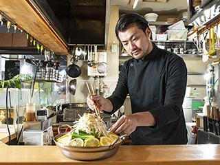 和食・中華・フレンチなどさまざまな業態で働いた経験がある店主が、モツ煮、鍋、鉄板焼きをはじめとした創作料理を提供します。釣り好きの店主が釣って店でさばく刺身や旬の野菜の天ぷら、お酒に弱い人でもするする飲める「自家製レモンサワー」も好評。